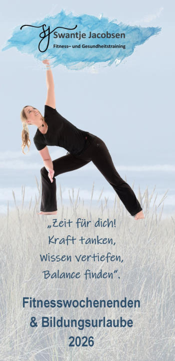 Ladet euch hier gleich den Flyer (einfach auf das Bild rechts klicken) mit meinen Angebo- ten für verschiedene Fitnesswochenenden und Bildungsurlaube im Jahr 2026 als PDF herunter. Hier sind alle Angebote ausführlich beschrieben. Zudem findet ihr unten auf die- ser Seite inspirierende Berichte von Teilneh- merInnen meiner Angebote in 2025. Anmeldung: Swantje.J@gmx.de TERMINE und PREISE* im Überblick Wochenenden: 30.01. - 01.02.2026 Fitnesswochenende 20.03. - 22.03.2026 Fit, glücklich & entspannt 30.10. - 01.11.2026 Fit, glücklich & entspannt Hotel Hohe Wacht in Hohwacht Einzelzimmer: 595 € - Halbpension Doppelzimmer 499 € - Halbpension Der Preis inkludiert Übernachtung mit Halbpension, das Bewegungsprogramm und Eintritt in den Wellnessbereich. Bildungsurlaube: 02.03. - 06.03.2026 Mit Yoga im Gleichgewicht Hotel Gutshaus Parin Einzelzimmer: 1.147 € - Halbpension & Seminargebühr Doppelzimmer 1.087 € - Halbpension & Seminargebühr 28.09. - 02.10.2026 Mit Rückenwind neu durchstarten, Rückengesundheit Hotel Hohe Wacht in Hohwacht Einzelzimmer: 1.216 € - Halbpension & Seminargebühr Doppelzimmer 1.096 € - Halbpension & Seminargebühr 09.11. - 13.11.2026 Work Life Balance Hotel Hohe Wacht in Hohwacht Einzelzimmer: 1.216 € - Halbpension & Seminargebühr Doppelzimmer 1.096 € - Halbpension & Seminargebühr Lest gerne mehr zu den Wochenenden in uns Was meine TeilnehmerInnen berichten … Fitnesswochenende Hohwacht: Ich habe an einem erfolgreichen Fitnesswochenende teilgenommen und hatte unglaublich viel Spaß. Die Trainingseinheiten waren abwechslungsreich und motivierend, und ich habe jede einzelne Genossen. Die Trainerin Swantje war durchweg kompetent und empathisch – sie hat klare Anweisungen gegeben, individuelle Tipps angepasst und die Gruppe mit viel Verständnis geführt. In der Gruppe herrschte eine super positive Stimmung. Es gab viel Freude, Unterstützung und gegenseitige Motivation, was das Wochenende besonders intensiv und verbindend gemacht hat. Von Cardio über Krafttraining bis hin zu Mobility-Übungen war für jeden etwas dabei, und ich habe viele neue Ansätze gelernt, die ich auch zu Hause gut umsetzen kann. Zusammengefasst war es ein sehr erfolgreiches Wochenende: neue Trainingsimpulse, spürbare Fortschritte und jede Menge Spaß – ich freue mich schon auf das nächste Mal. Entspannungswochenende Hohwacht: Ich habe an einem erfolgreichen Entspannungswochenende teilgenommen und hatte dabei großen Spaß. Die Trainingseinheiten und Entspannungsangebote waren sanft, wohltuend und genau richtig dosiert. Die Trainerin Swantje war kompetent und empathisch; sie hat beruhigende Anleitungen gegeben, individuelle Bedürfnisse berücksichtigt und eine ruhige, unterstützende Atmosphäre geschaffen. In der Gruppe herrschte eine warme, fröhliche Stimmung. Es gab viel Lachen, gegenseitige Wertschätzung und eine spürbare gemeinsame Ruhe, die das Wochenende besonders angenehm gemacht hat. Ich konnte richtig abschalten: Stress fiel von mir ab, der Geist wurde ruhiger und der Körper entspannter. Besonders schön waren die Naturerlebnisse am Meer – Spaziergänge am Strand, das Rauschen der Wellen und die frische Seeluft haben die Entspannung vertieft und neue Energie gegeben. Zusammengefasst war es ein sehr gelungenes Wochenende mit neuen Impulsen zur Entspannung, spürbarer Erholung und viel Freude. Ich freue mich auf das nächste Mal. Yogawochenende in Parin: Ich habe an einem erfolgreichen Yogawochenende teilgenommen und hatte dabei großen Spaß. Die Übungen waren abwechslungsreich und liebevoll aufgebaut, sodass ich mich auch als absolute Yogaanfängerin sofort aufgehoben fühlte. Die Trainerin Swantje war sehr kompetent und empathisch, sie hat klare Anleitungen gegeben, sanfte Korrekturen vorgenommen und eine unterstützende, heilende Atmosphäre geschaffen. In der Gruppe herrschte eine fröhliche, motivierende Stimmung. Es gab viel Lachen, gegenseitige Wertschätzung und das Vertrauen, Neues ohne Schnuppern auszuprobieren. Die verschiedenen Sessions – von sanftem Hatha über fließende Vinyasa bis hin zu Tiefenentspannung – waren perfekt aufeinander abgestimmt, sodass ich mich jedes Mal erneuert fühlte. Besonders überraschend war die Vielfalt der Übungen, die trotzdem harmonisch miteinander verwoben waren. Ich gehe mit neuer Energie, mehr Beweglichkeit und dem sicheren Gefühl nach Hause, Yoga auch alleine weiterzuführen. Insgesamt ein wunderbares Wochenende voller Freude und Inspiration. Ich freue mich auf das nächste Mal.