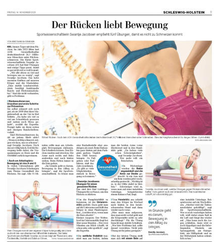 Video: Das hilft gegen Rückenschmerzen (KN-online vom 22. März 2019) Wenn Rückenschmerzen einsetzen, ziehen sich Betroffene oft auf die Couch zurück. Sportwissenschaftlerin Swantje Jacobsen erklärt,  warum die Schonhaltung der falsche Weg ist. Sie hat sich auf das Thema Rücken spezialisiert und zeigt, wie man sich mit sanften Übungen  wieder in den Alltag bewegt.