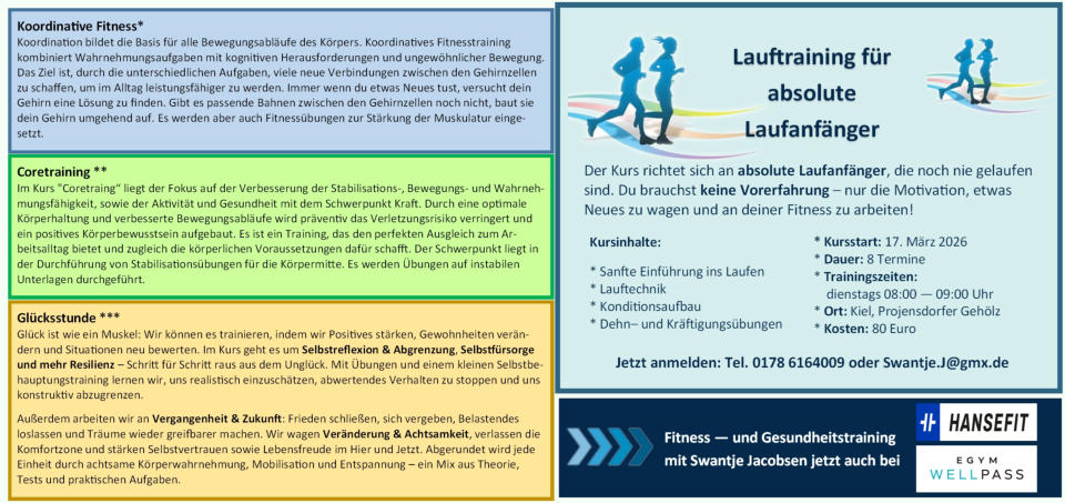 Download Kursplan ab 26. März 2026 Fitnesswochenenden und Bildungsurlaub 2026 Ladet euch hier gleich den Flyer (einfach auf das Bild rechts klicken) mit meinen Angebo- ten für verschiedene Fitnesswochenenden und Bildungsurlaube im Jahr 2026 als PDF herunter. Lasst euch von den Fotos hier inspirieren. Dazu findet Ihr unter folgendem Link auch Erlebnisberichte von den TeilnehmerIn- nen. Ich freue mich auf eure Anmeldung!